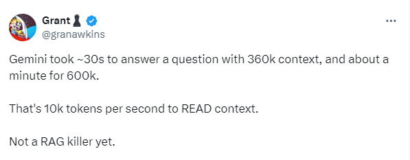 The Gemini 1.5 model is in developer preview, so we may not be seeing the ultimate performance, but the early indications are that Gemini 1.5 is very slow to process large context windows–between 30s and 1 minute.