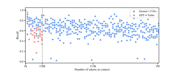 From the chart you can see that although Gemini 1.5 is better than GPT-4 Turbo (within the overlapping context window range) and Gemini can maintain its recall capabilities all the way to 1M tokens, the average recall hovers around 60%. The context window may be filled with many relevant facts, but 40% or more of them are “lost” to the model. If you want to make sure the model is actually using the context you are sending it, you are best off curating it first and only sending the most relevant context. In other words, doing traditional RAG.